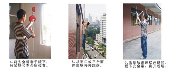 (2) 將******帶套入逃生者適當(dāng)位置,并拉緊滑動(dòng)扣,準(zhǔn)備跳落。
